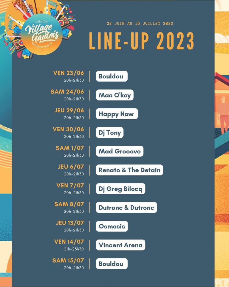 S’il reviendra à Bouldou la lourde responsabilité d’ouvrir les festivités le premier jour (vendredi 23 juin), et de les refermer l’avant-dernier jour (samedi 15 juillet), la programmation a surtout mis en valeur quelques DJ locaux et des artistes en formation acoustique, afin d’assurer des prestations musicales de qualité, chaudes en ambiance mais aussi propices à la rencontre et à la discussion sur les terrasses du Village Gaulois. L’on ne peut citer toutes les animations, mais il convient de mettre déjà en exergue les jeunes liégeois de Mac O ‘Koy (samedi 24 juin), Renato ( jeudi 6 juillet), et le bien connu Vincent Arena pour enflammer la soirée du 14 juillet. Des démonstrations de salsa sont également attendues les mardis soirs… Tous les concerts sont programmés de 20h à 21h30 ; le programme complet et le détail peuvent être consultés sur la Page Facebook du Village : www.facebook.com/villagegauloisofficiel.