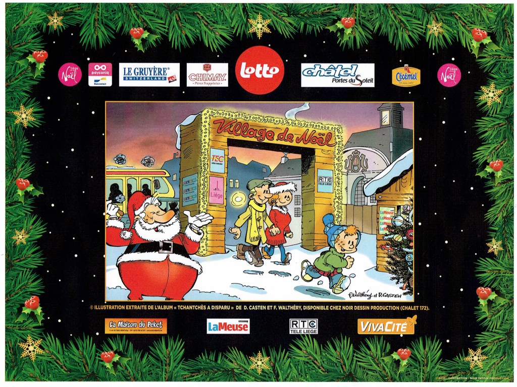 L’enceinte du Village de Noël sera décorés de 21 panneaux mettant en avant trois thèmes : Liège, Noël et la BD. Tous les panneaux feront référence à Liège dans la bande dessinée, au travers d’agrandissements de cases issues d’albums parus et mettant Liège en avant-plan. Le thème de Noël sera largement visible par la reproduction de couvertures d’albums ou de cases ayant Liège et Noël comme point commun. Le visiteur curieux pourra retrouver, dans cette exposition grand format, des grands noms de la BD belge : François Walthéry, Marc Hardy, Didier Casten, Malik, Peyo, Franquin, Marc-Renier, et bien d’autres encore… Un bel « emballage cadeau » pour le Village !