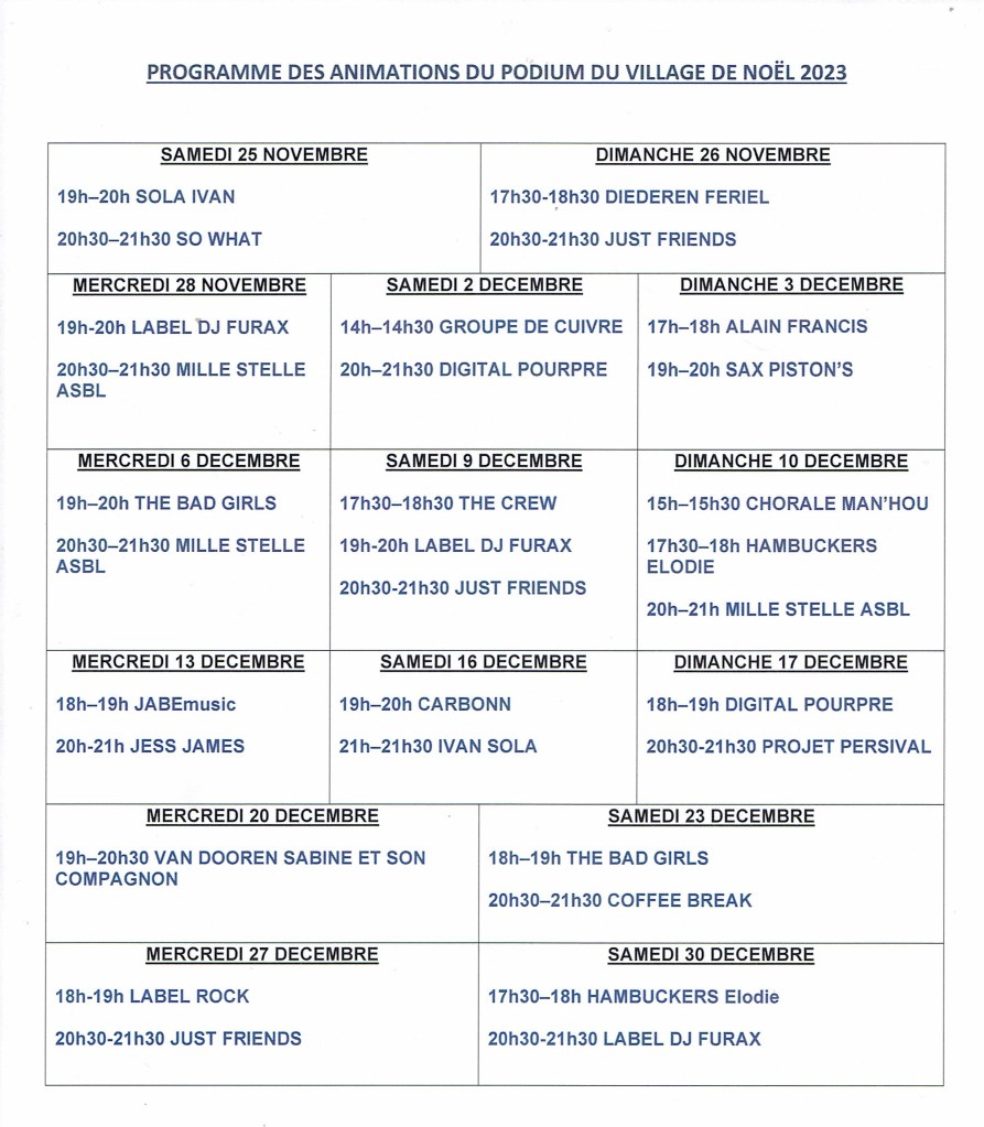 Tous renseignements et programme des animations sur le site www.villagedenoel.be ou sur la page Facebook du Village de Noël.
