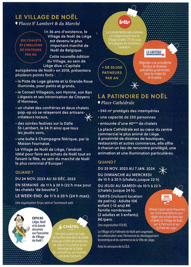 Le « Village de Noël » de l’an 2023, trente-sixième du nom et dont l’entrée est entièrement libre, est ouvert du vendredi 24 novembre au samedi 30 décembre, sur la place St-Lambert et la place du Marché de Liège, tous les jours, de 11 à 20 heures (22 h max. la semaine, et minuit le week-end).