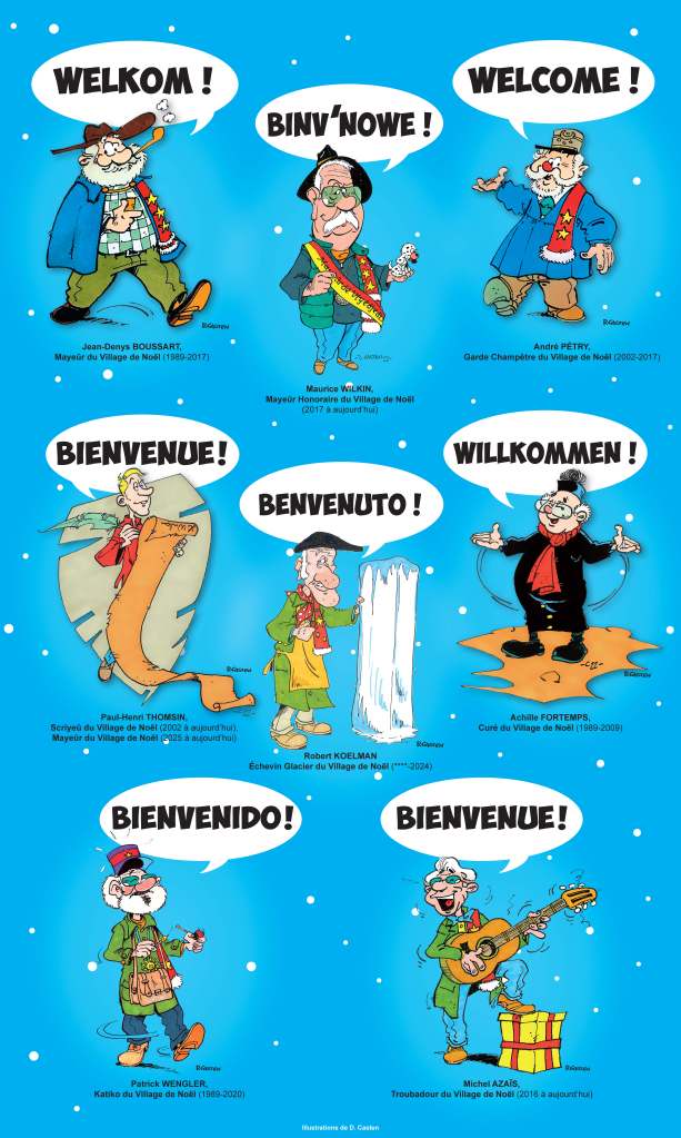 L’échevin Didier Casten complète chaque année d’un nouveau personnage la galerie « BD » des conseillers villageois les plus célèbres ; cette année, c’est Robert Koelman, l’échevin « glacier » du Village de Noël qui nous a quittés fin de l’année dernière, qui rejoint ses confrères sur les panneaux aux entrées du Village….